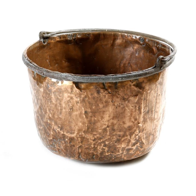 A copper logbin, with a wrought iron swing handle, 45.5cm high, 53.7cm wide.