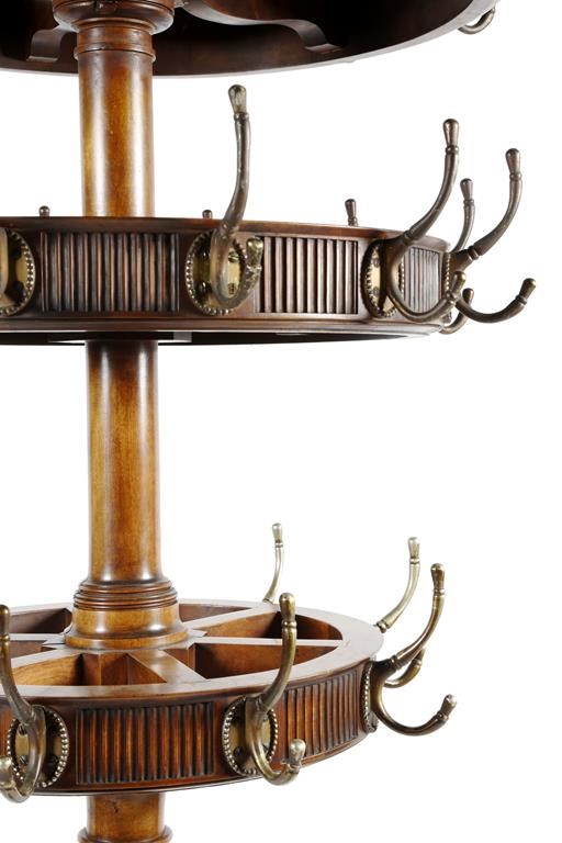 Maritime interest. An early 20th century walnut revolving three tier coat rack, with thirty-five gilt nickel hooks, with a baluster turned stem on tripod legs, with a base with three bolts, this coat stand was probably made for an ocean liner as the bolts would have attached it to the deck, 215cm high, 83cm diameter.