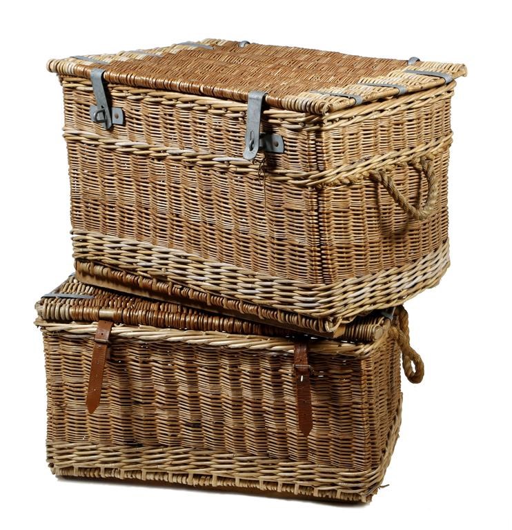 Two wicker laundry baskets, each with rope handles, one with leather straps, 55.5cm high, 85.3cm wide, 56.5cm deep (max). (2)