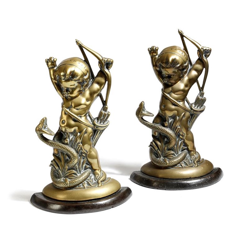 A pair of Victorian brass doorstops, each modelled with the infant Hercules strangling a snake, stamped with registration number '53035' and with a weighted base, 40.5cm high, 26cm wide. (2)