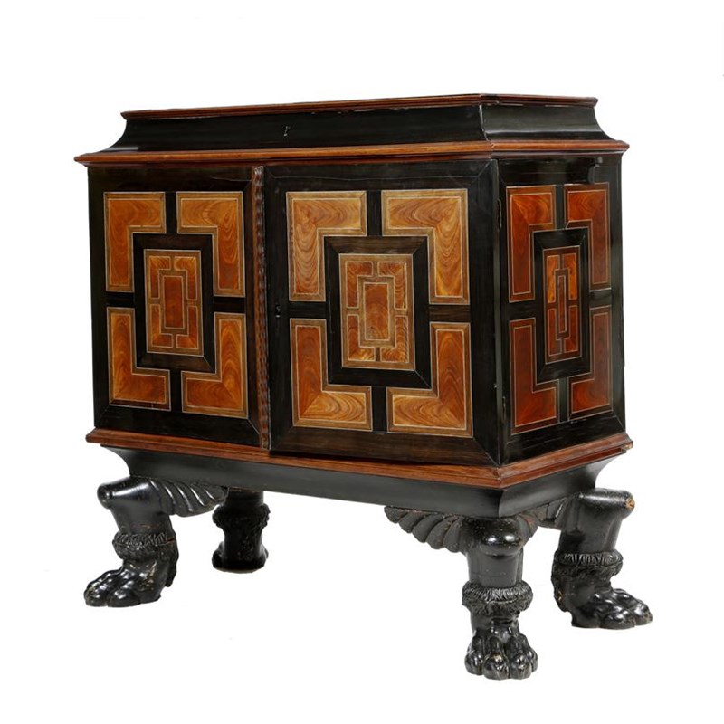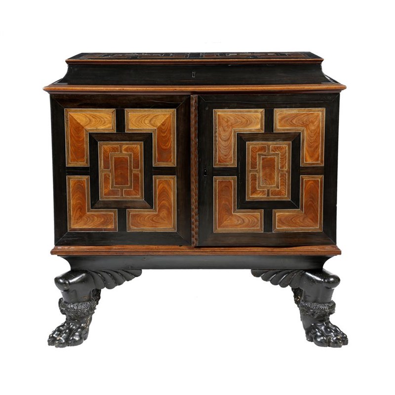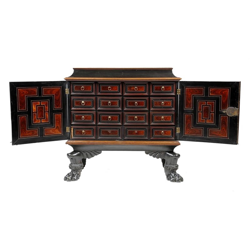 λ A Flemish ebony and kingwood cabinet, inlaid with ivory stringing, with geometric panelled decoration, the hinged top revealing a vacant compartment above a pair of doors with a ripple moulding, enclosing an arrangement of nine drawers, three with veneered linings, all fitted with later brass ring handles, originally with side carrying handles, late 17th / early 18th century, on an associated and later ebonised stand with winged paw feet, 94.8cm high, 103cm wide, 47.7cm deep.