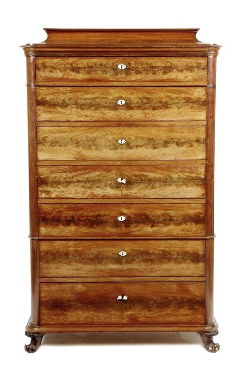 A 19th century continental mahogany semainier, the pagoda top above seven long graduated drawers with book matched veneers, with bone escutcheons and scroll front feet, in two parts, 162.5cm high, 98.8cm wide, 50cm deep.
