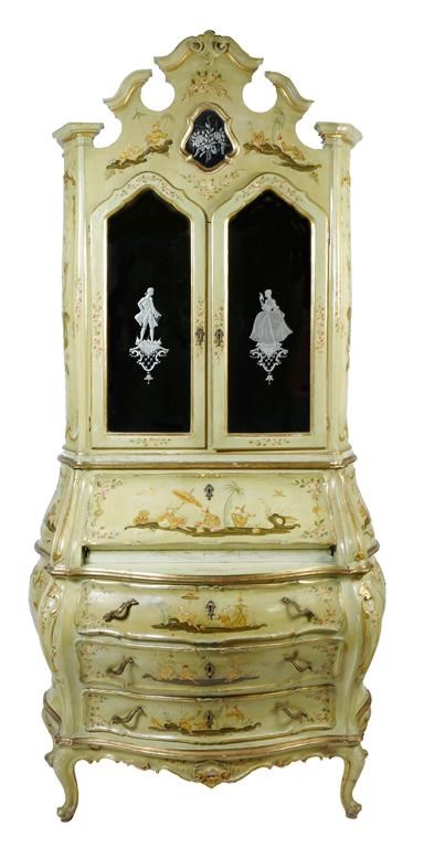 An 18th century style Italian Venetian green lacquered bureau bookcase, decorated with gilt highlights and painted with chinoiserie figures, signed 'BULEGATO', the top with a central etched mirrored panel and a pair of doors also with mirrors etched with a gentleman and lady, enclosing a mirrored interior with six drawers, the bombe base with a hinged fall, above three drawers, mid 20th century, 238.5cm high, 118.5cm wide, 52cm deep.