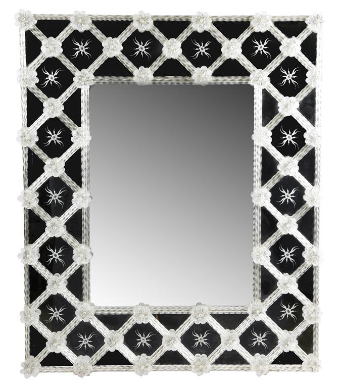 An Italian Venetian glass wall mirror, with a rectangular plate within a moulded lattice outer border, with applied florets and etched with flowers and leaves, late 20th century, 122 x 102cm.
