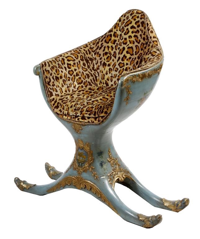 An Italian Venetian lacquered and painted gondolier's chair, with parcel gilt decoration, the back painted with flowers, with a faux leopard skin covered seat, above a sleigh type base painted with the lion of St Mark and with stylised fish head feet, probably late 18th / early 19th century, 95.7cm high, 93.5cm wide, 43cm deep.