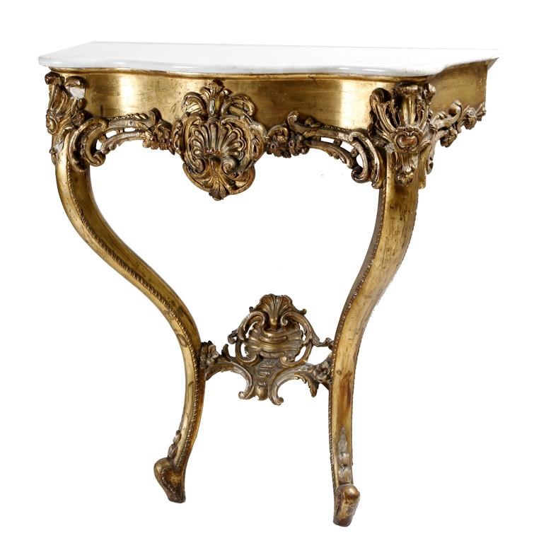 A Louis XV style giltwood console table, the serpentine white marble top above a frieze carved with scrolls and centred with a cartouche, on cabriole legs, 83cm high, 79.3cm wide, 32.6cm deep.