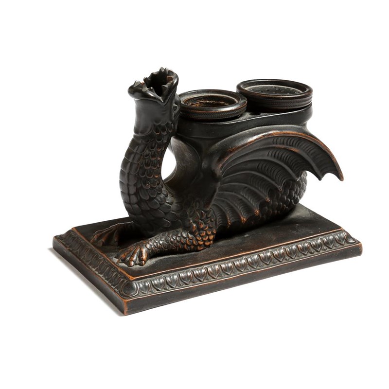 A patinated pottery inkstand, in the form of a recumbent dragon, the beast's open mouth as a penholder and with a lift-out inkwell and sander, the base with impressed marks '15 S & G', probably for Shore & Goulding, late 18th / early 19th century, 10.5cm high, 15.7cm wide.