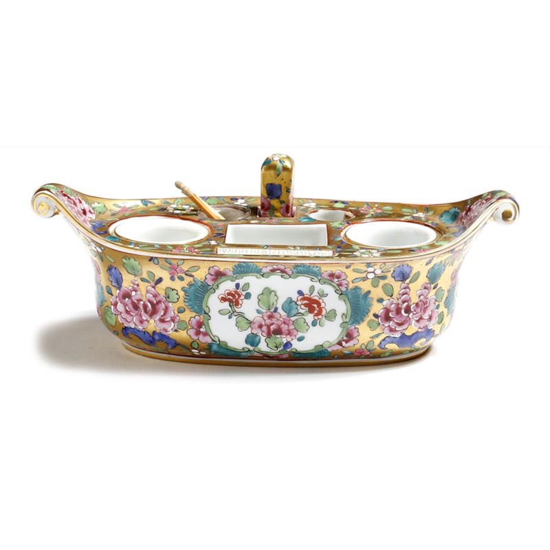 A continental porcelain navette shape inkstand, with scroll handles, painted with enamel flowers and leaves on a gilt ground, with a pair of lift-out inkwells, a matching seal, a striker plate for vestas and three other apertures, 21.3cm wide.
