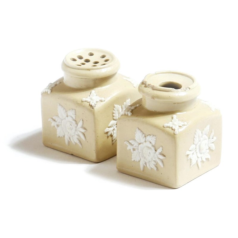 An early 19th century stoneware smear-glazed inkwell, with applied floral sprays, together with a matching sander, possibly by Ridgway, 4cm high. (2)