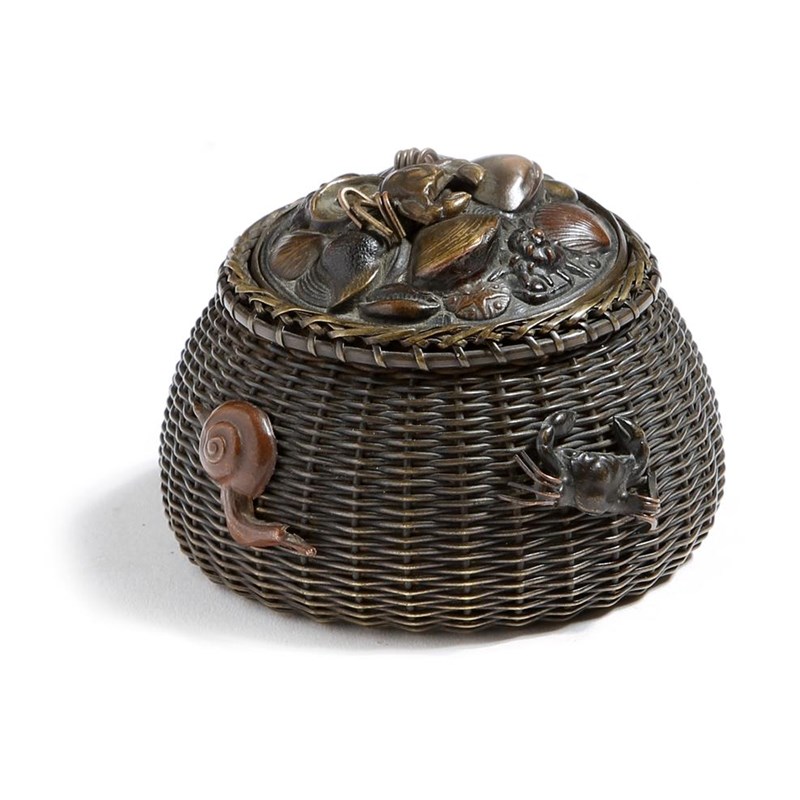 A Japanese bronze and copper inkwell in the form of a fish basket