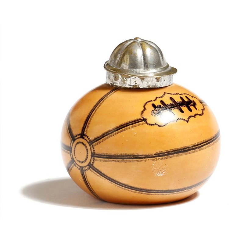 A novelty pottery inkwell in the form of a rugby ball, with a hinged gilt metal lid in the form of a cap, the base with the registration number '167875', first registered in 1891, late 19th / early 20th century, 7.5cm wide.