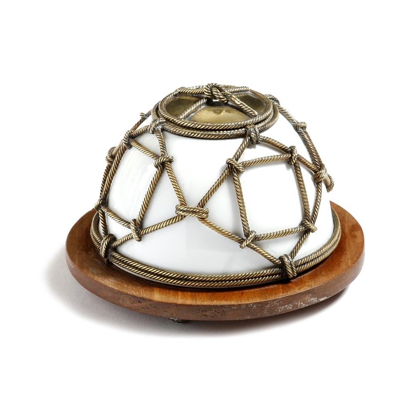 A French opaline glass inkwell, decorated with bronze rope work, with a lift-off lid on a mahogany base and flower head feet, late 19th century, 11.7cm diameter.