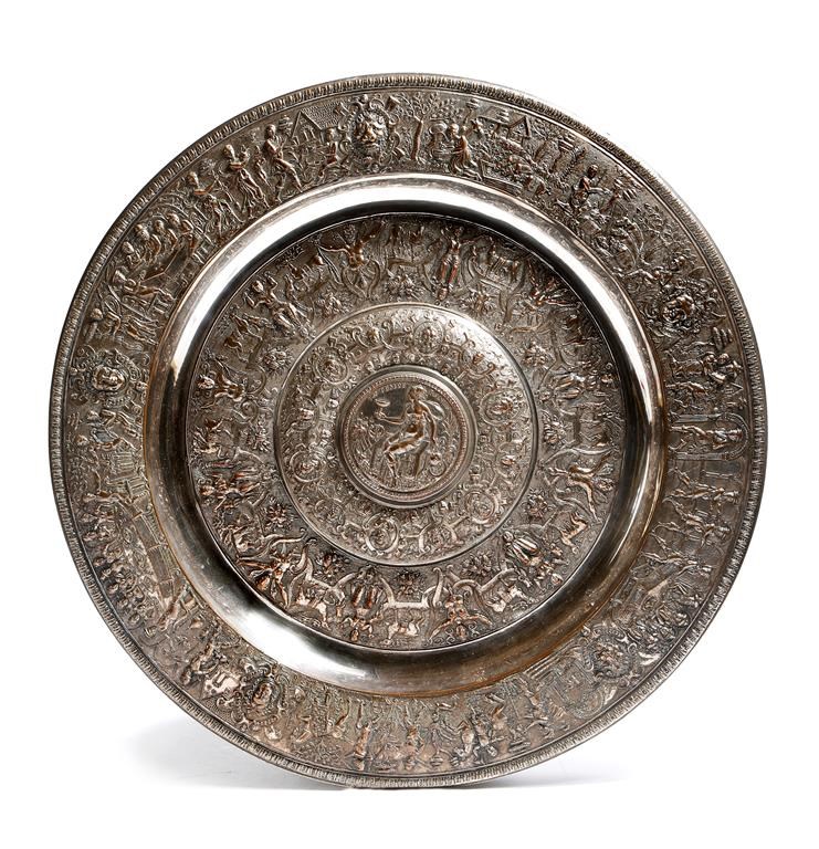 After François Briot. A Victorian electroplate 'Temperantia' basin by Elkington, cast in relief with figures, caryatids, masks, strapwork birds and various scenes, the centre with Temperance holding a wine cup and ewer, inscribed 'TEMPE RANTIA', the reverse with a plaque inscribed 'VR Department of Science & Art, Elkington', 44.2cm diameter.