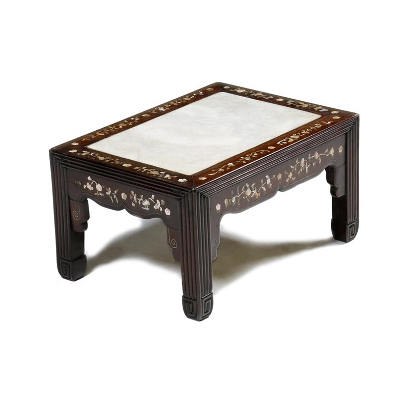 A Chinese hardwood and mother of pearl stool, with a marble inset top and inlaid with leaves and flowers, on reeded scroll legs, late 19th century, 25.8cm high, 48.6cm wide, 35cm deep.
