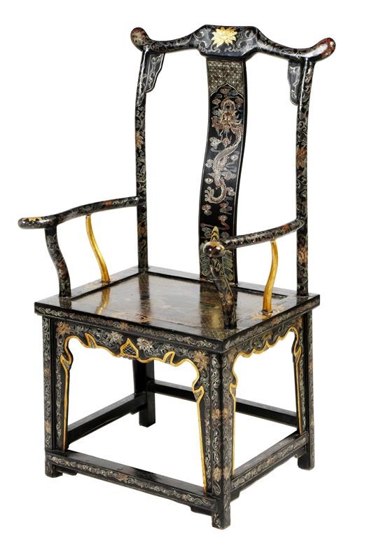 A Chinese black lacquer yoke back armchair