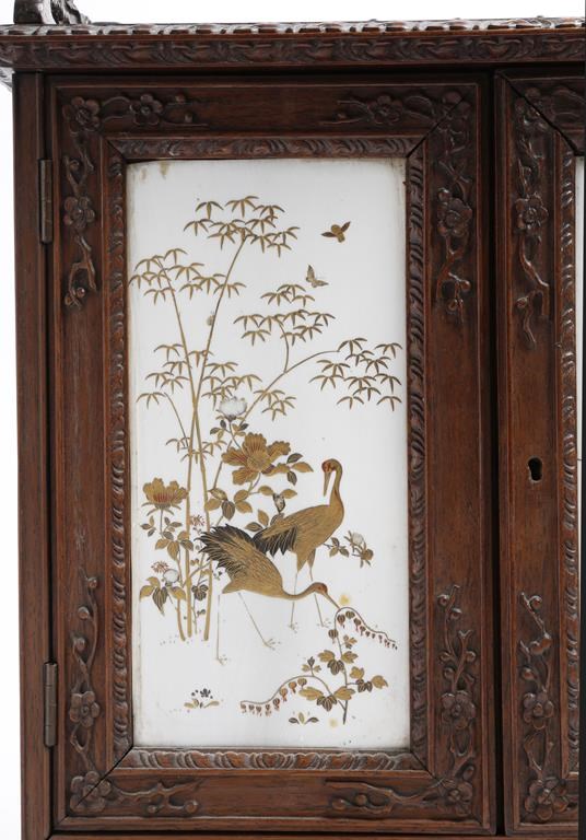 λ A Chinese hardwood tobacco table cabinet, carved with dragons and prunus blossom, with a pair of doors inset with ivory panels, decorated in gilt with a pair of cranes and a peacock, enclosing three drawers and a compartment for pipes, above a base drawer (locked), late 19th century, 37.8cm high, 33.7cm wide, 14.2cm deep.