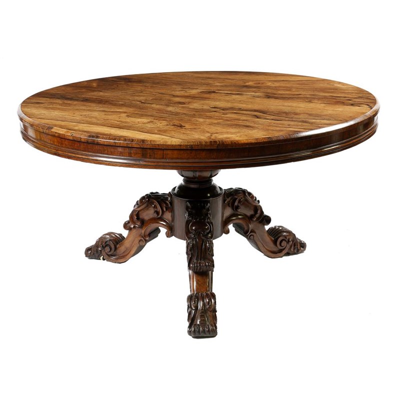 λ A William IV rosewood breakfast table, the circular tilt-top with a moulded edge, on a lobed stem and leaf, cartouche and scroll carved tripod supports and sunken brass castors, 72.5cm high, 131cm diameter.