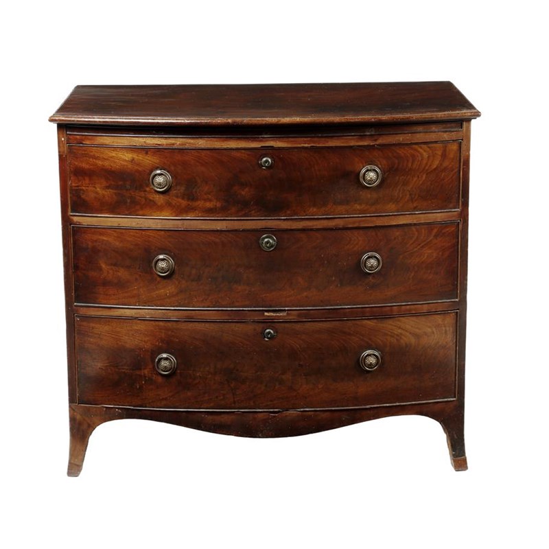 A Regency mahogany bowfront chest, the top with a moulded edge above a brushing slide and three long graduated drawers all fitted with Bramah locks, 80.8cm high, 91cm wide, 55.7cm deep.