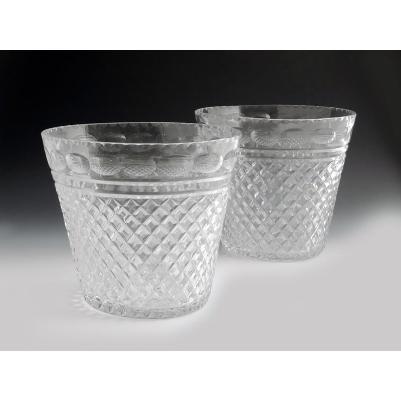A pair of 19th century moulded glass oval ice buckets, with diamond cut tapering bodies, 24.8cm high, 30.5cm wide, 24cm deep. (2)
