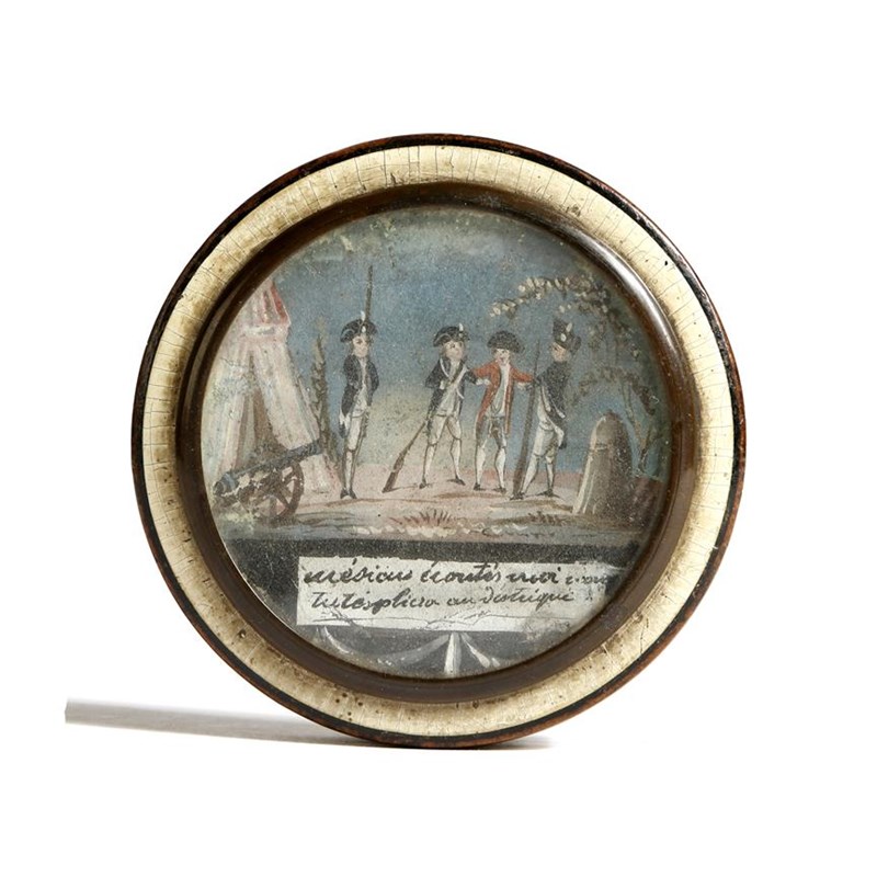 An early 19th century French Napoleonic lacquered snuff box, the lid painted with soldiers at camp, indistinctly inscribed, with a faux tortoiseshell interior, the base with a paper label inscribed in pencil 'This box belonged to my paternal grandmother....(1850)....from France by her 2nd husband.....', 8.1cm diameter.