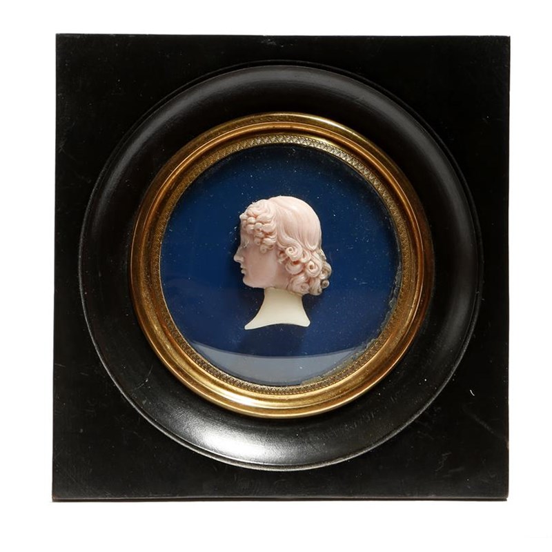 Giovanni Antonio Santarelli (Italian 1758-1826). A wax portrait relief bust of a young lady, in an ebonised frame, the verso with a printed paper label inscribed 'Gio. Ant. Santarelli a Firenze, 1809', 12.3 x 12.1cm.