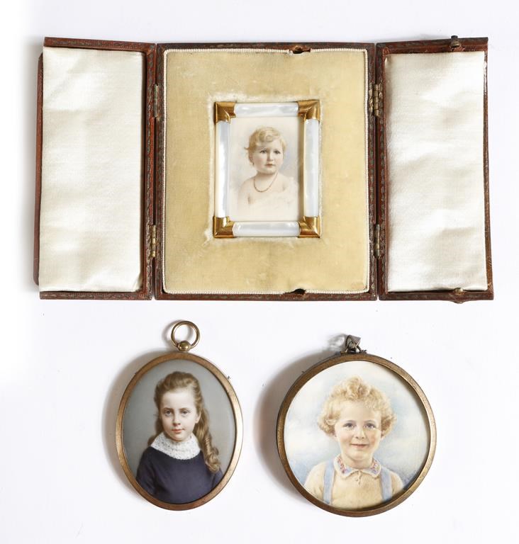 λ A late 19th century porcelain oval portrait miniature of a girl, together with a portrait miniature on ivory of a girl, signed 'Bowen' and another portrait miniature of a young girl wearing a coral necklace, in a mother of pearl and gold frame, mounted in a leather case, 6.1cm diameter (max). (3)