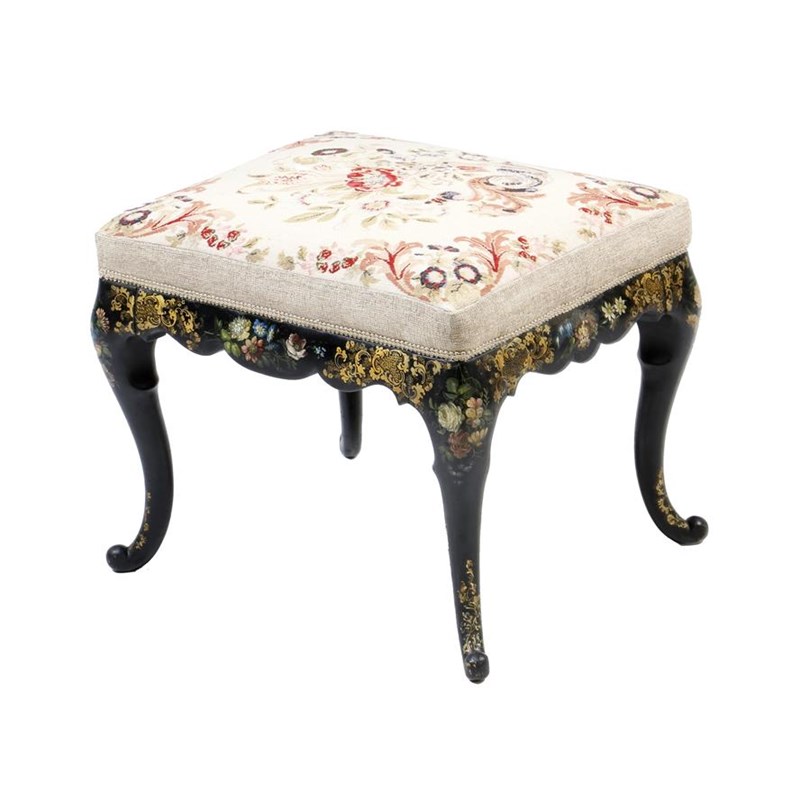 A Victorian papier-mâché stool, with a floral needlework seat, the base painted with flowers and with gilt highlights, stamped 'W S', 47.5cm high, 57cm wide, 46.4cm deep.