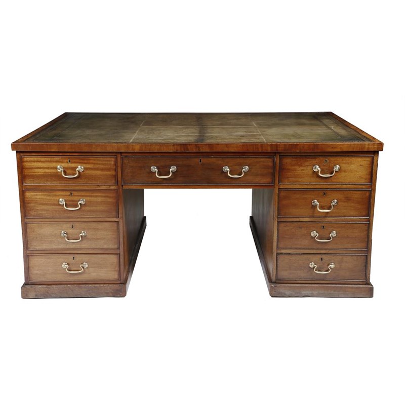 A George III style mahogany twin pedestal partner's desk, with a gilt tooled leather top above an arrangement of nine drawers to the front and a drawer and a pair of arched panelled doors to the reverse, one fitted with slides, the other with shelves, on castors, 82.5cm high, 183cm wide, 119.3cm deep.