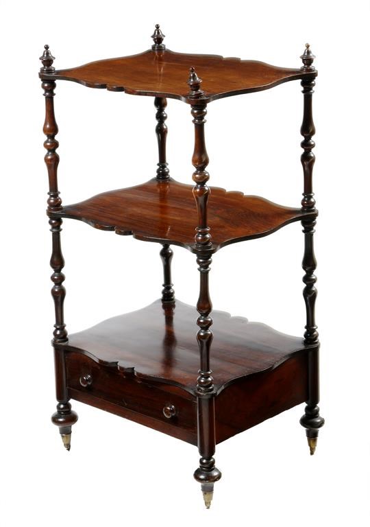 λ An early Victorian rosewood whatnot, with three serpentine edge tiers and baluster turned supports, the base with a drawer, on brass castors, 97.2cm high, 51.7cm wide, 41cm deep.