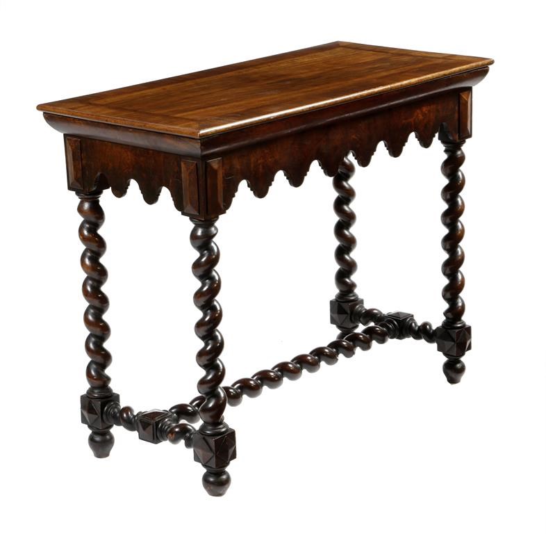 A Victorian walnut centre table in 17th century style, the top with feather and crossbanding, above an arcaded frieze and on spiral twist stretchered supports, 75.8cm high, 92.4cm wide, 45.8cm deep.