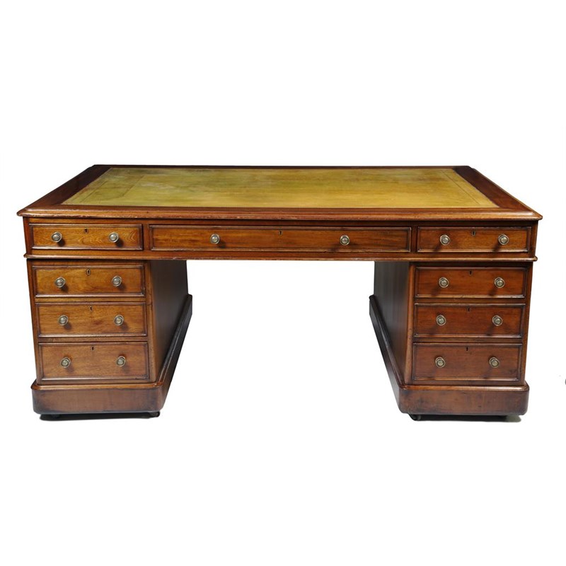 A mahogany twin pedestal partner's desk, the top inset with a gilt tooled green leather writing surface, fitted with an arrangement of nine drawers and with a pair of arched cupboard doors, each enclosing a shelf, on metal castors, late 19th / early 20th century, 78.8cm high, 182.1cm wide, 119.7cm deep.