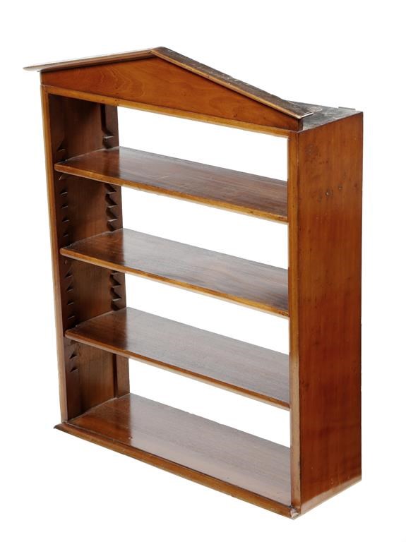 A set of Victorian mahogany hanging wall shelves, with an architectural pediment above three adjustable shelves, 86.5cm high, 71.5cm wide, 22.3cm deep.