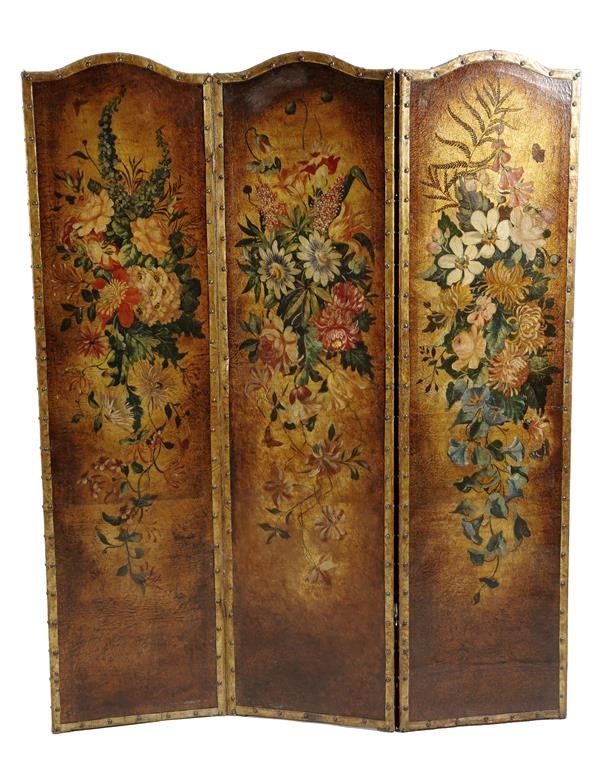 A leather three-fold screen, each panel painted with flowers and butterflies on a gilt ground, late 19th century, 175cm high, 46cm wide (each panel).