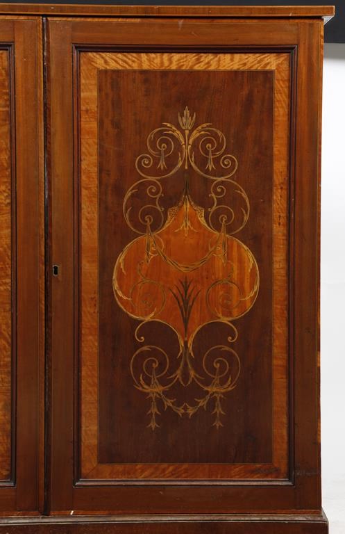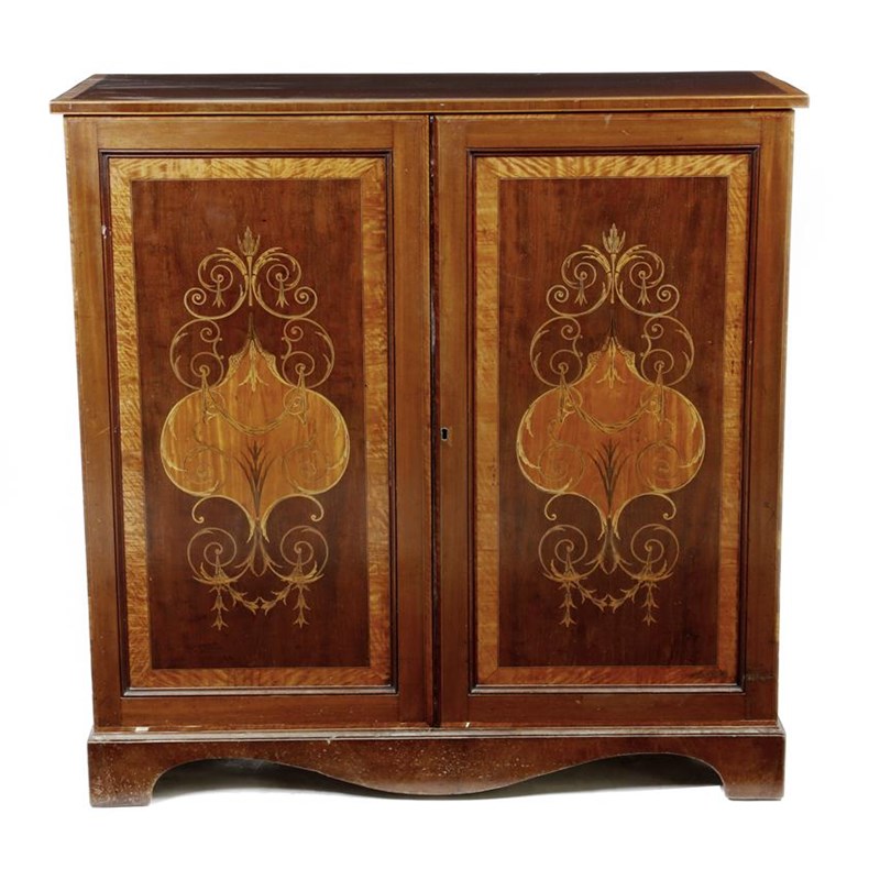 A 19th century mahogany and marquetry cabinet, inlaid with stringing and satinwood banding, with a pair of doors inlaid with scrolling foliage enclosing six short and three long graduated drawers, 114.8cm high, 115.2cm wide, 46.3cm deep.