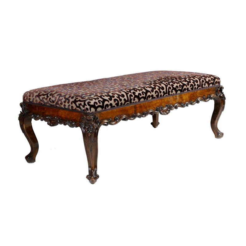A Victorian burr walnut stool, the later upholstered seat above a scroll carved frieze, on leaf and flower carved cabriole legs, 48.5cm high, 128cm wide, 68cm deep.