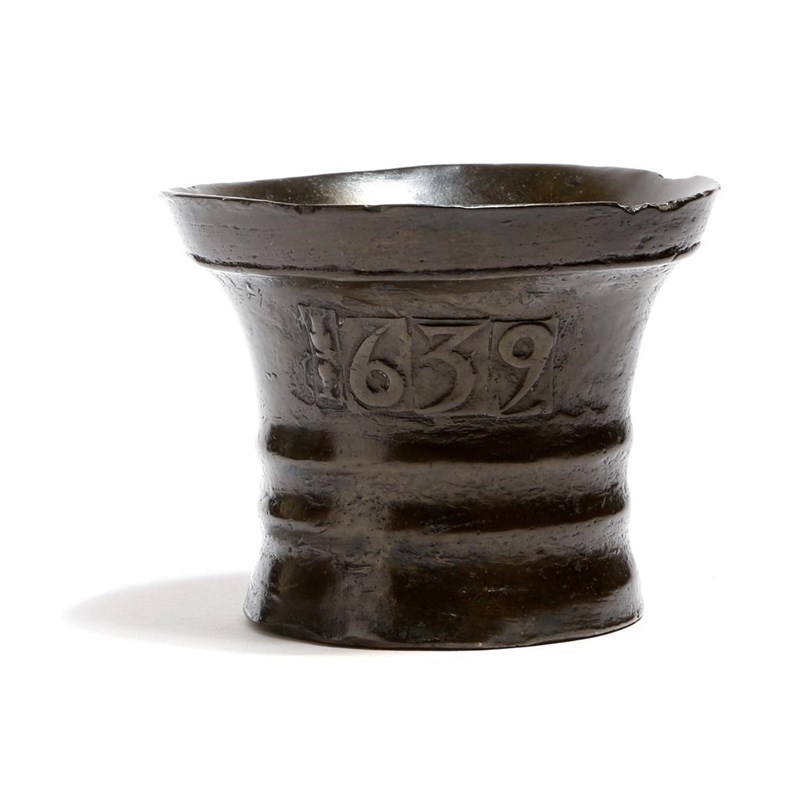 A Charles I dated bronze mortar attributed to Robert Oldfield of Hertford, the moulded body with the date '1639', the '1' a distinctive shape, 11.5cm high, 14.5cm diameter.