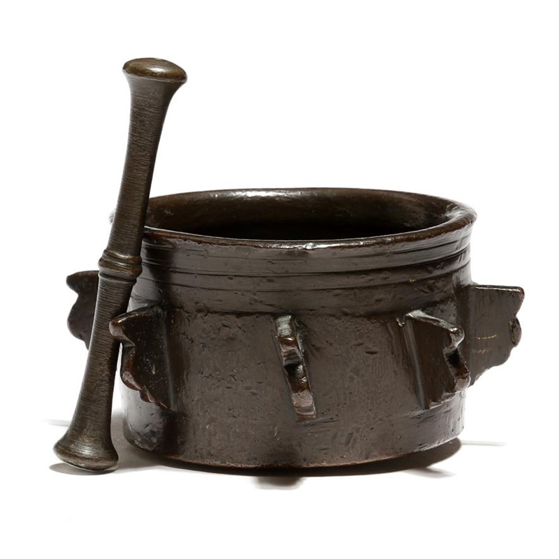 A 15th century Iberian bronze mortar, with eight shaped projecting lugs, with incised bands, together with an associated turned pestle, 14cm wide. (2)