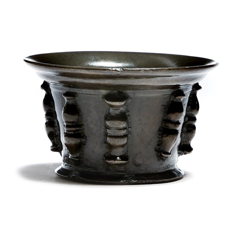 A 17th century Iberian bronze mortar, the body decorated with split balusters, 8.1cm high, 13.3cm diameter.