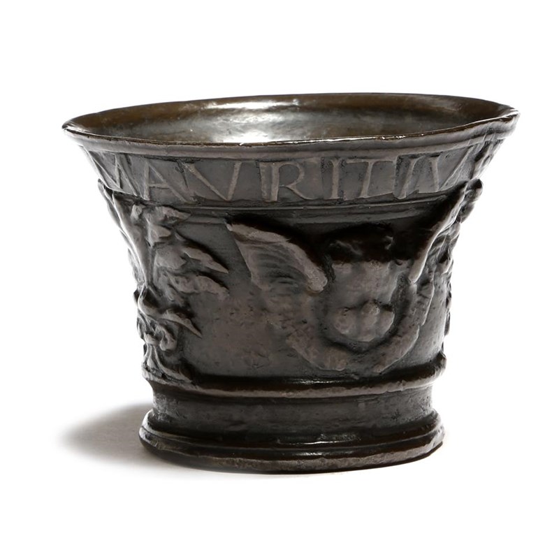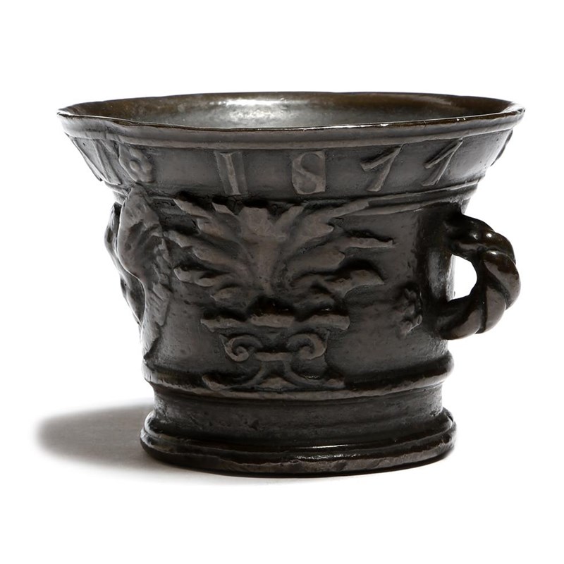 A 16th century Dutch dated bronze mortar, the rim inscribed 'MAURITIV' and with 'M' flanked by rosettes and the date '1577', the body with a winged cherub mask flanked by foliage and with a horseshoe over an anvil, with a rope-twist handle, 9cm high, 13cm wide.