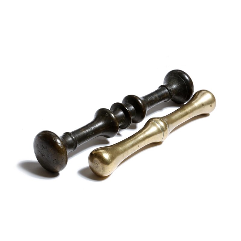 A bronze turned double-ended pestle, probably 17th century Iberian, together with a polished bronze double-ended pestle, probably early 18th century, 19cm long (max). (2)