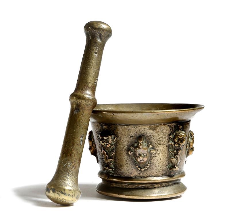 A French bronze mortar, the body decorated with cherub heads interspersed with foliage and scroll ribs, 16th / 17th century, together with an associated pestle, 10.3cm high, 14.5cm diameter.