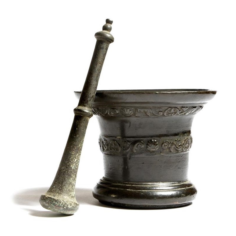 A 17th century bronze mortar attributed to the Whitechapel Foundry in London, decorated with two bands of scrolling foliage and shells, together with an associated pestle, 14.4cm high, 18.1cm diameter.