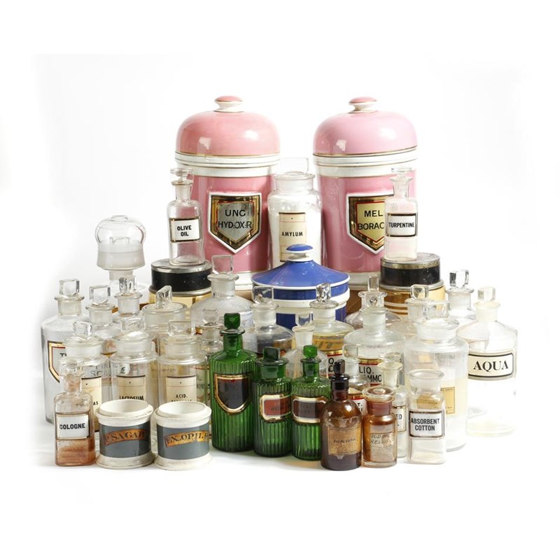 A collection of glass and pottery apothecary jars and bottles, including a pair of Victorian pottery pink ground jars and covers, inscribed 'MEL: BORACIS' and 'UMG: HYD:OX:R', each with a paper label for 'F. W. WRENCH, CHEMIST, BOURNEMOUTH', and also three ribbed green glass examples, the base of one marked 'ES & CO., L, REGISTERED NO. 263897', 19th century and later, 27.7cm high (max). (38)