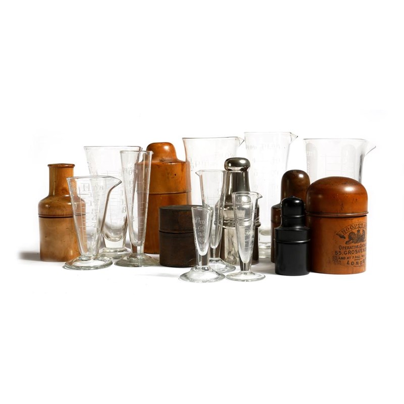 A selection of glass measuring jars and bottles, comprising: three bottles and stoppers in boxwood turned cases, one in an ebony case, one in a metal case, a leather cased medicine glass and measure (glass missing) and a powder puff in a boxwood case inscribed 'HOOPER & CO. LONDON', together with nine stem glass measures, 19th century and later, 16cm high (max). (16)
