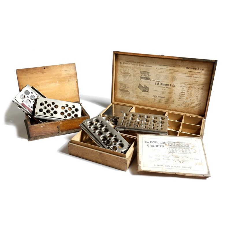 An Edwardian cachet maker set by S. Maw Son & Sons, London, the lid with a printed label inscribed 'The POPULAR CACHETS', in a pine box, together with a cachet maker set by Konseals and another cachet machine and moulds in a wooden box, 44.3cm wide (max). (3)