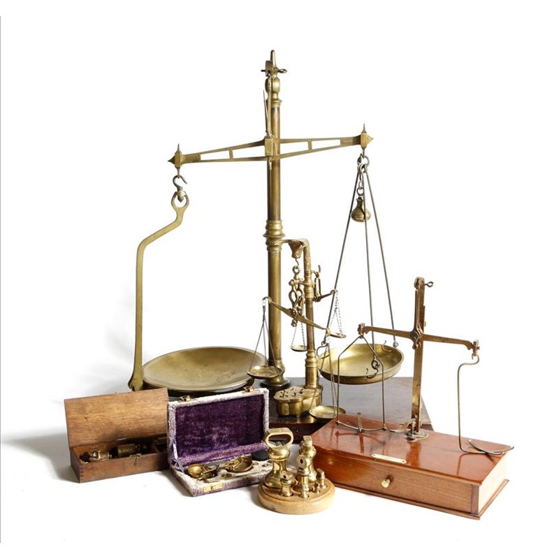 A collection of balance scales, comprising: a brass set with a mahogany box base by D.E. Grave Short & Co. Ltd., a set by W & T Avery Ltd with seven weights, an unusual scales with a bull's head terminal and five weights and two other cased sets, 66.7cm high (max). (5)