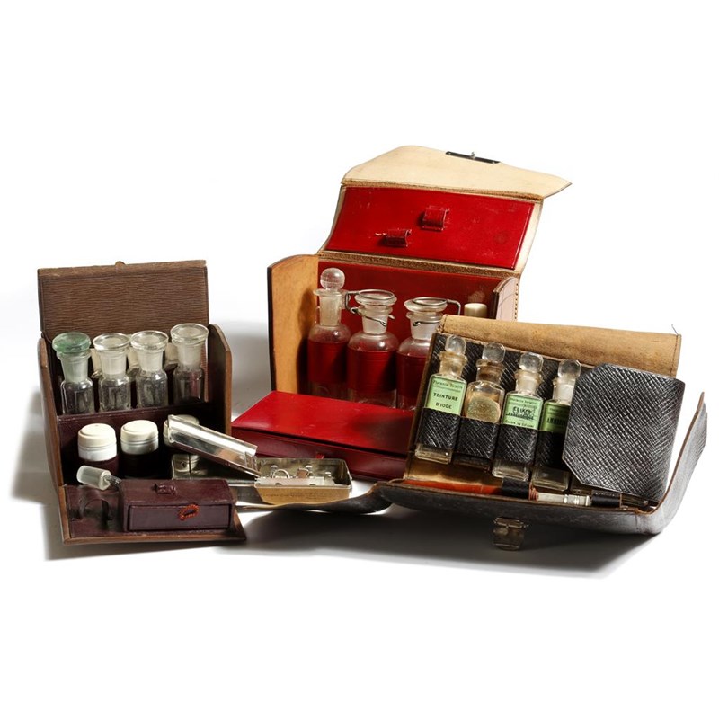Three leather travelling apothecary cases, each fitted with glass bottles and stoppers, one stamped 'Kum stock im Eisen, WIEN I. KARNTHNERSTRASSE 1.', one stamped with a 'double R' monogram in a cross, together with a Burroughs Wellcome & Co. 'Tabloid' hypodermic case, 17cm wide (max). (4)