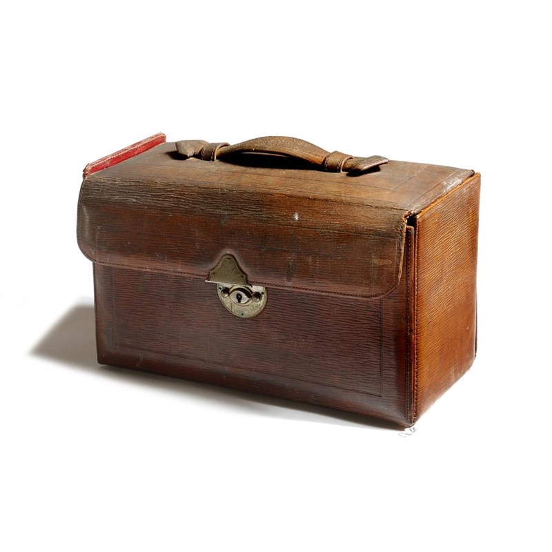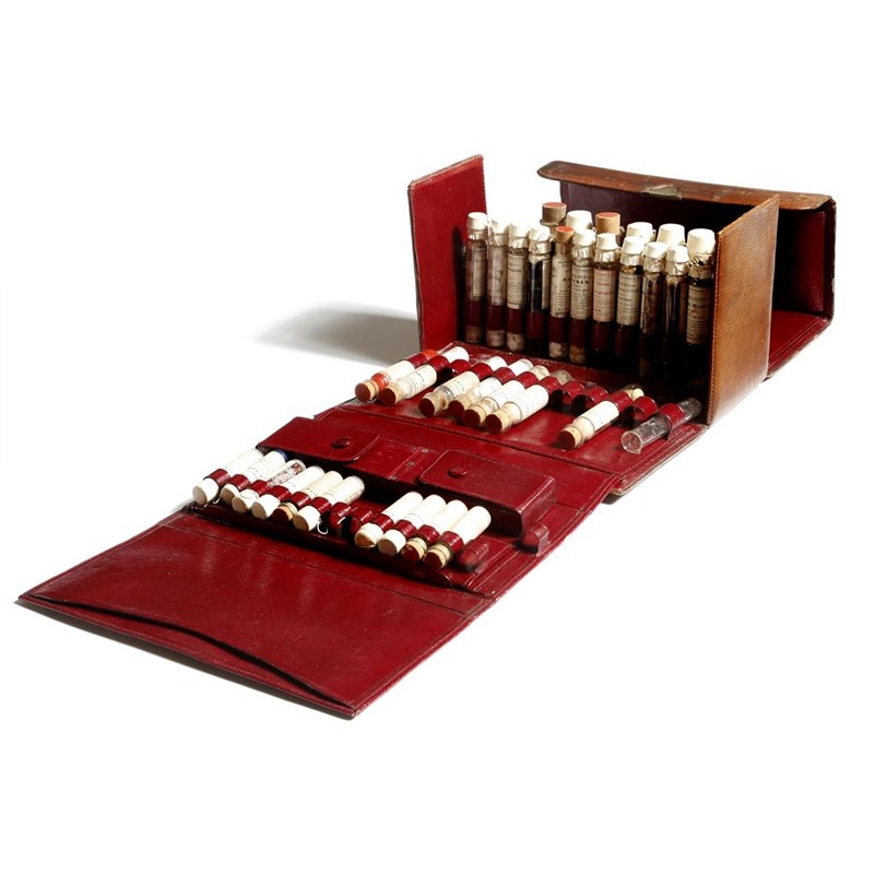 A rare late Victorian leather 'Tabloid' apothecary's travelling case, with a strap handle, the interior fitted with utensil holders, a pouch and with various glass bottles with cork stoppers and with original contents, stamped 'TRADE MARK "TABLOID" BRAND BURROUGHS WELLCOME & CO. LONDON, SYDNEY & CAPETOWN.', with registered number '419543', with a tooled view of factories inscribed 'WORKS AND LABORATORIES OF BURROUGHS WELLCOME & CO.', 17.3cm high, 26cm wide, 12.5cm deep.