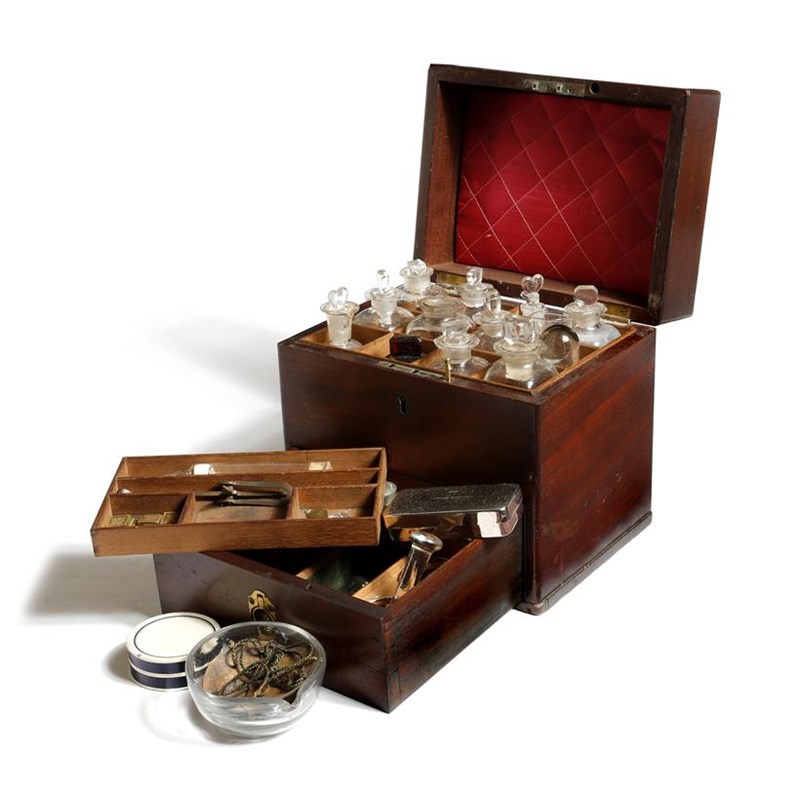 A George III mahogany apothecary's box, the hinged lid with a gilt brass handle, revealing a divided interior fitted with eleven bottles and stoppers (one missing) and a measure and a pestle, with a base drawer, with a lift-out tray fitted with a pestle and mortar, a set of scales and further bottles, a syringe and other items, 22cm high, 21.6cm wide, 16.5cm deep.