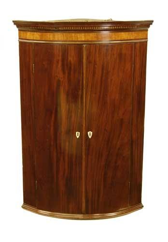 A George III mahogany bowfront hanging corner cupboard, with a satinwood dentil cornice and frieze above four shelves and two spice drawers, 42.5in (108.2cm) h, 29.5in (75cm) w, 20.5in (52cm) d. Lock and escutcheons replaced, restoration.